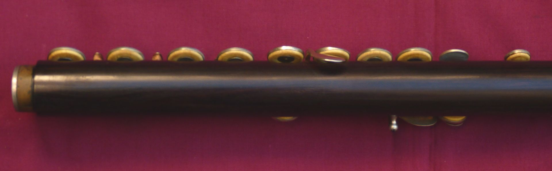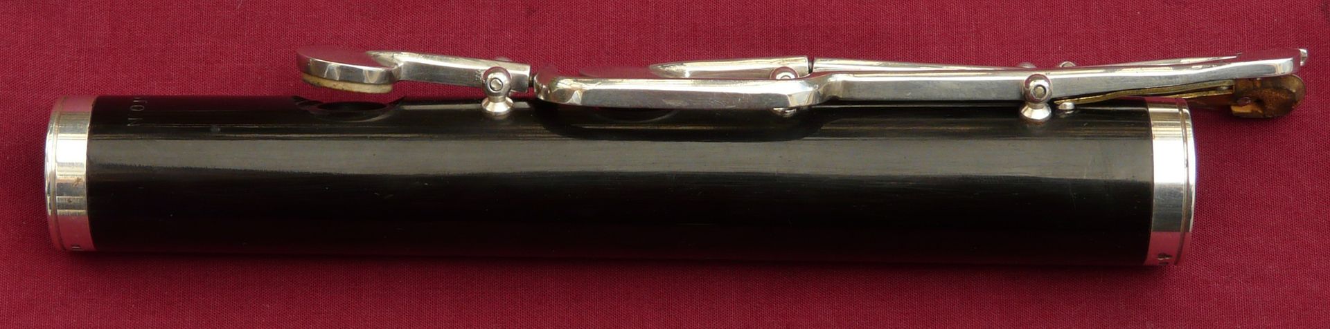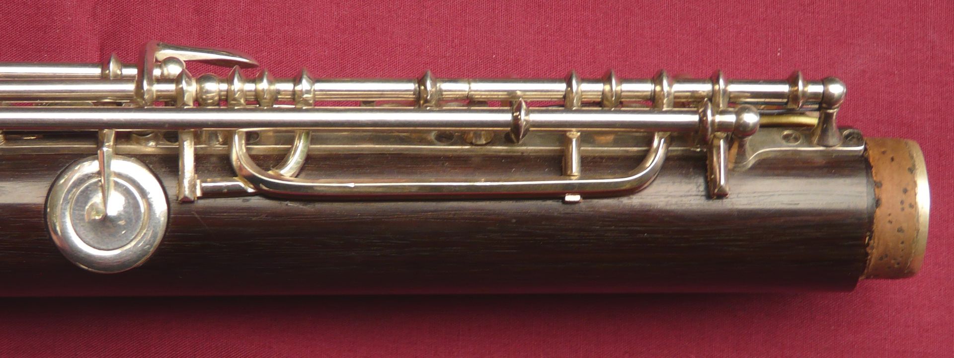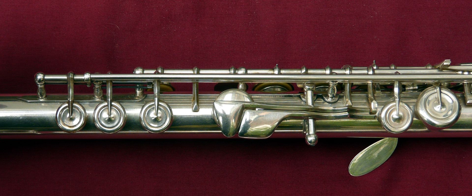 This unique Rudall Carte was rebuilt probably in the 1960s, when the superb pinless mechanism was made for the right hand mechanism. It is the work of a top ex-Carte craftsman such as Harry Seeley. We repadded this flute a couple of years ago, and have given it a service ready for sale. It plays as well as it looks!