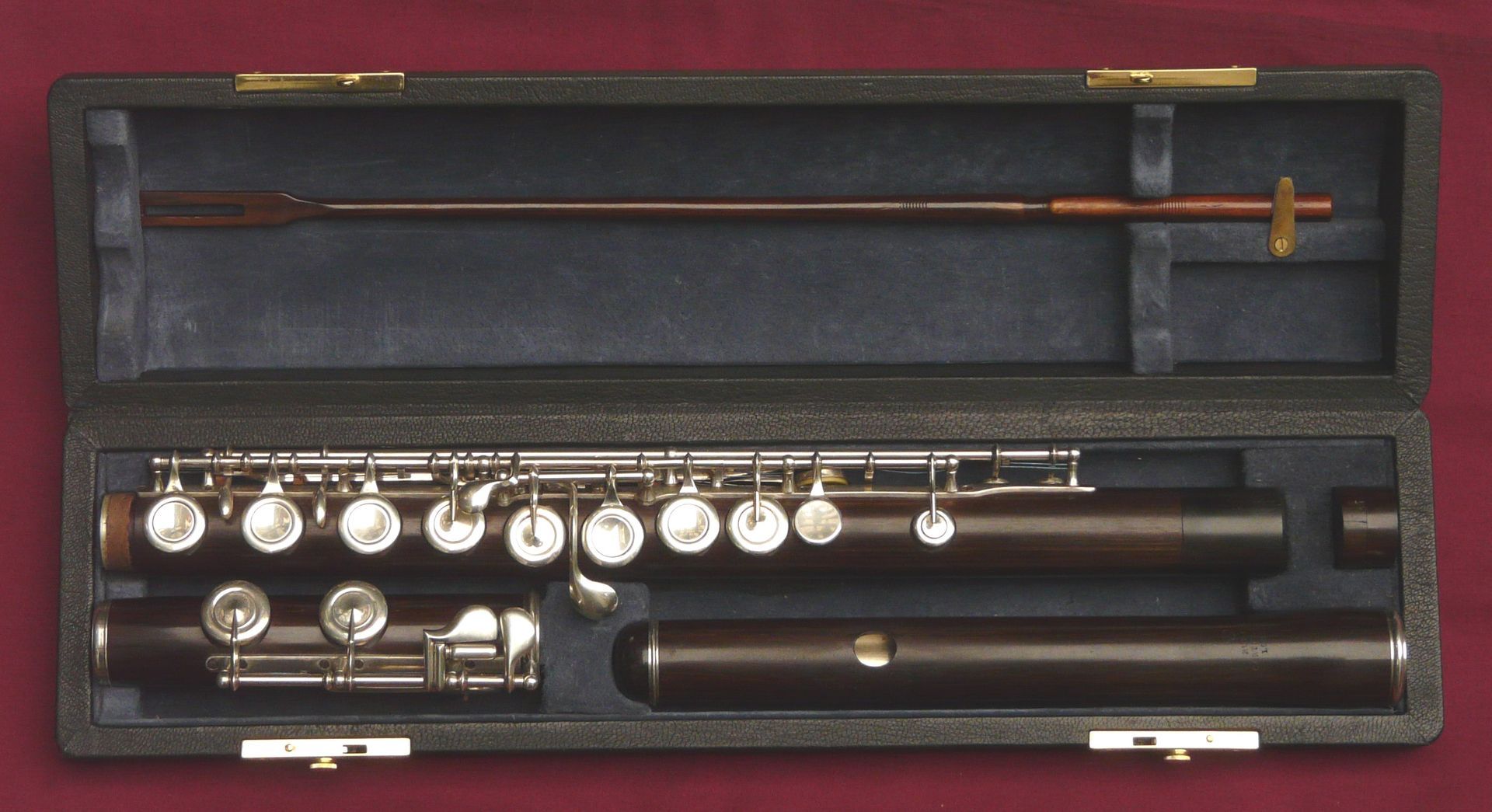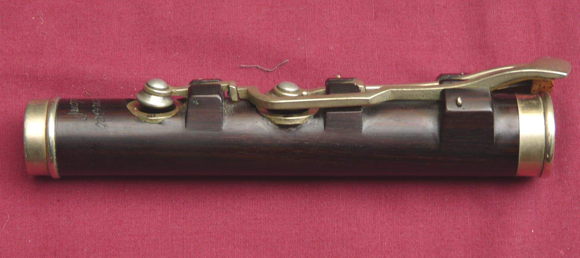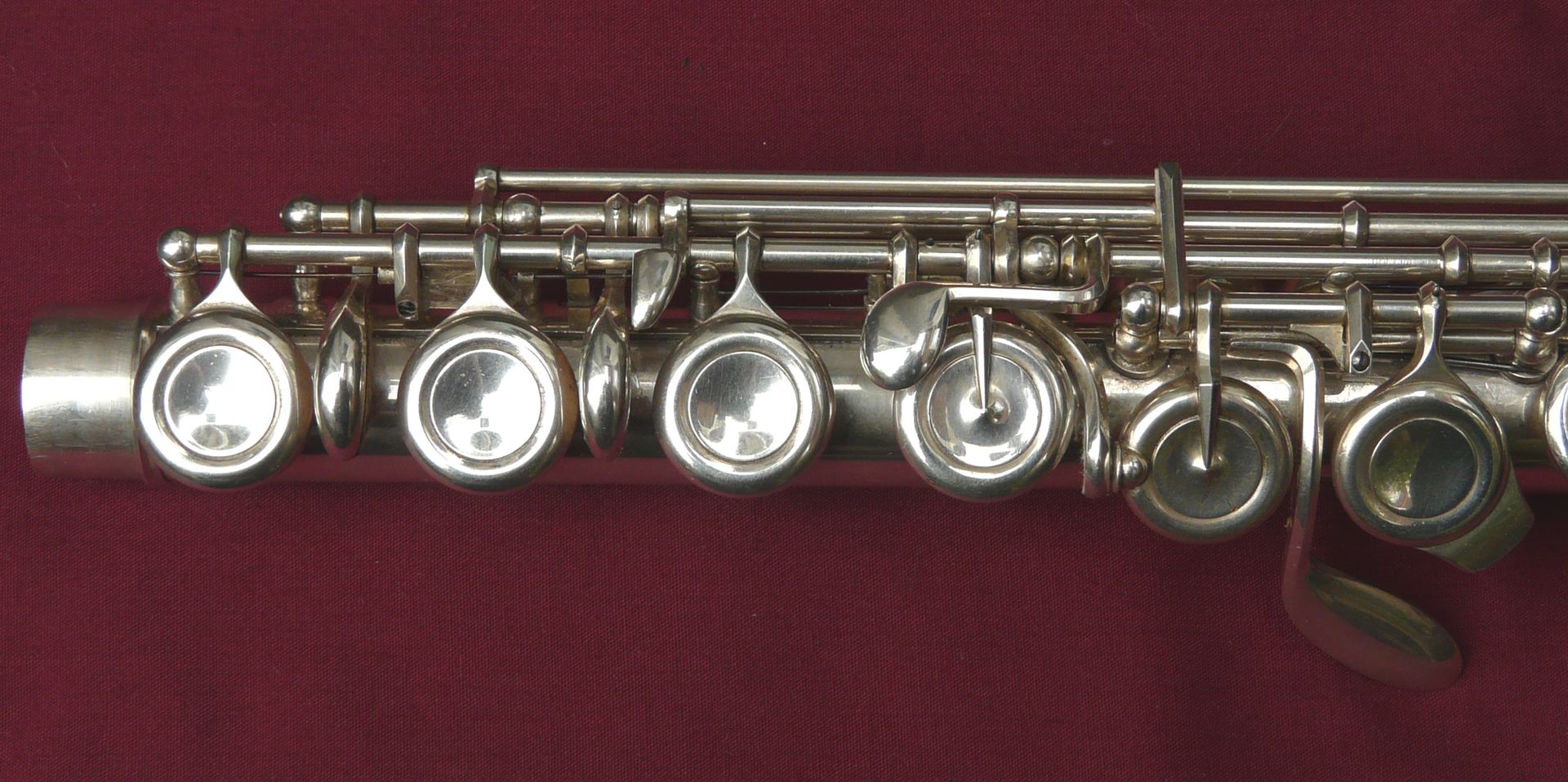 This unique Rudall Carte was rebuilt probably in the 1960s, when the superb pinless mechanism was made for the right hand mechanism. It is the work of a top ex-Carte craftsman such as Harry Seeley. We repadded this flute a couple of years ago, and have given it a service ready for sale. It plays as well as it looks!