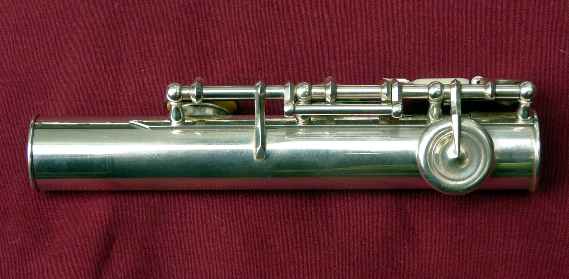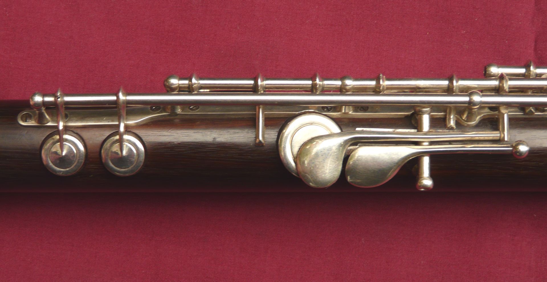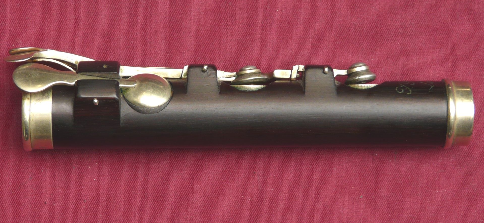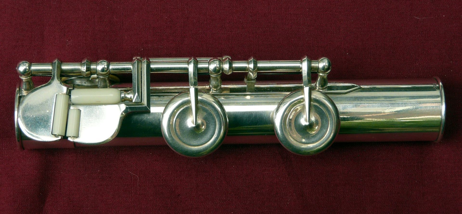This unique Rudall Carte was rebuilt probably in the 1960s, when the superb pinless mechanism was made for the right hand mechanism. It is the work of a top ex-Carte craftsman such as Harry Seeley. We repadded this flute a couple of years ago, and have given it a service ready for sale. It plays as well as it looks!